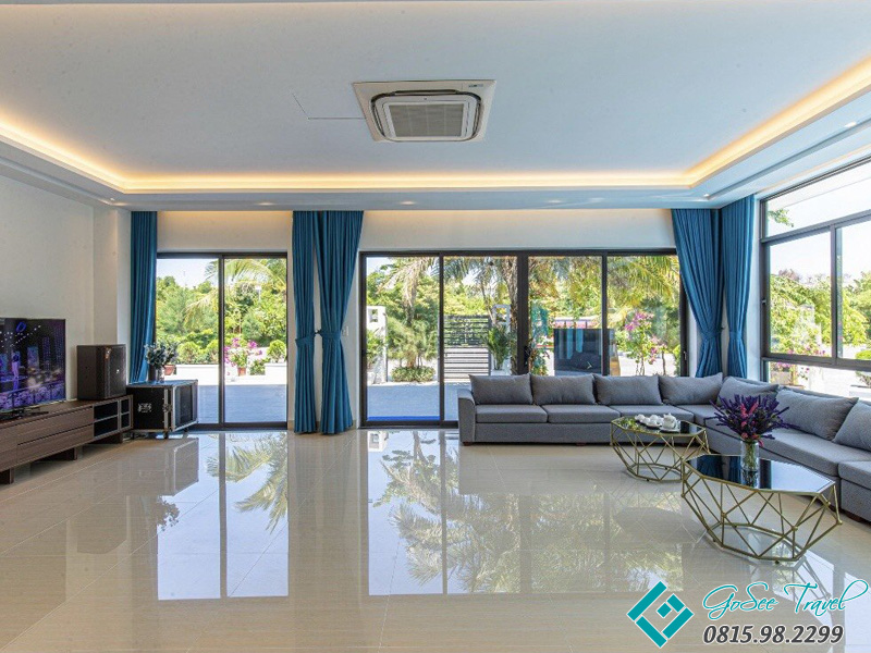 ✓ 1 phòng khách rộng : Tivi 65in, truyền hình internet TV, Điều hòa, Quạt cây, Wifi, Bàn ghế tiếp khách uống trà, Karaoke, WC